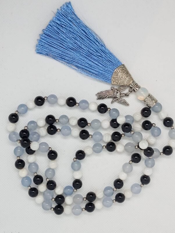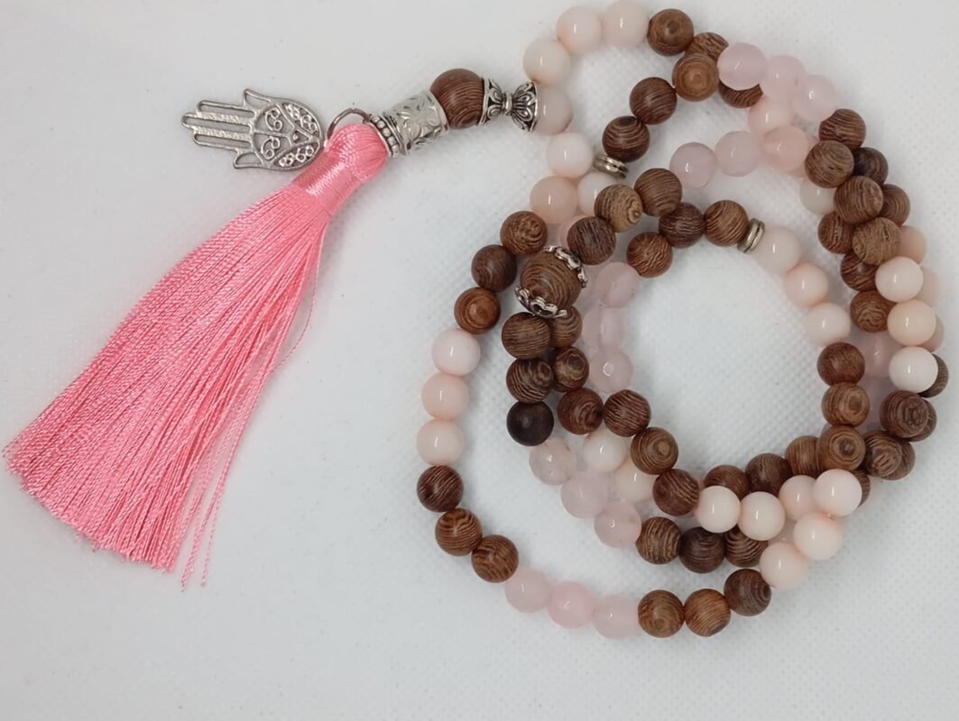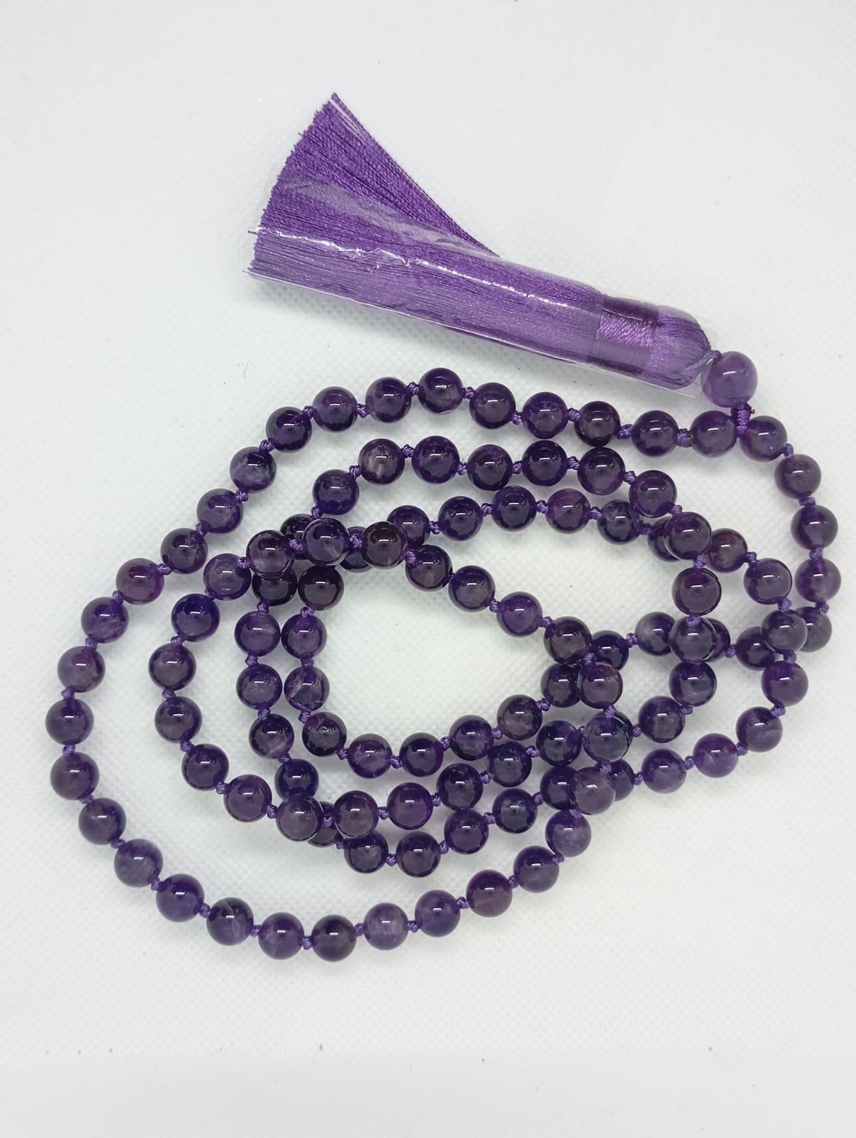 Ametista: cristal da consciência e elevação espiritual. Este Japa Mala acalma a mente, protege energeticamente e aprofunda a meditação, promovendo clareza, intuição e paz interior.