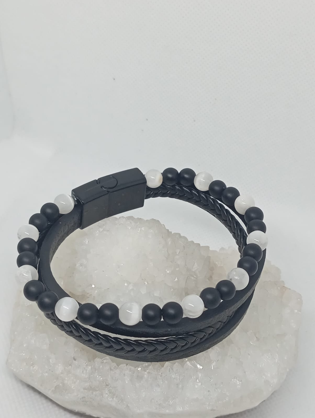 Pulseira Cabedal Selenite e Onix 6mm